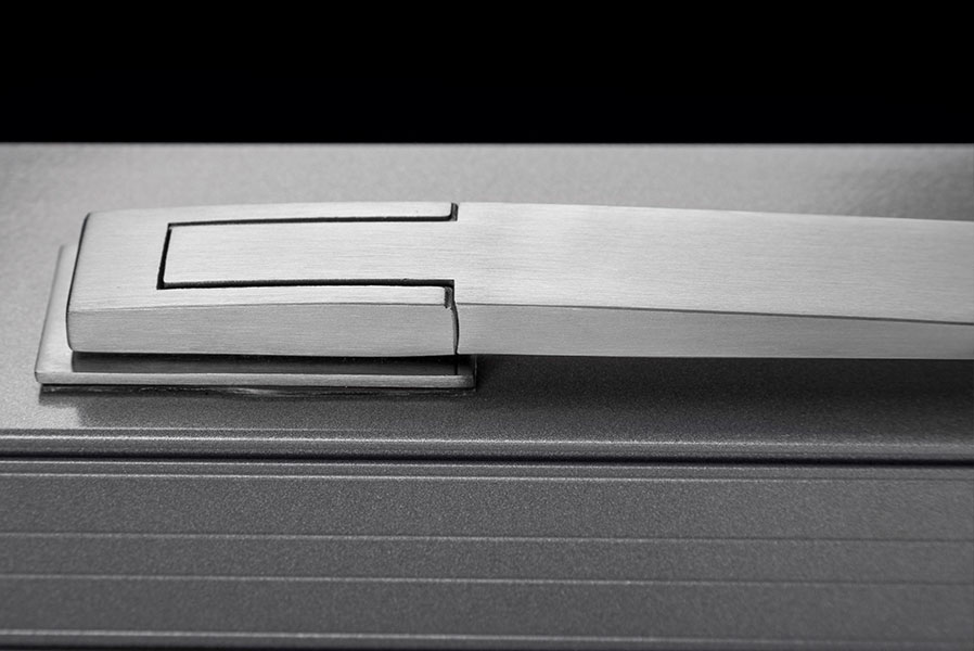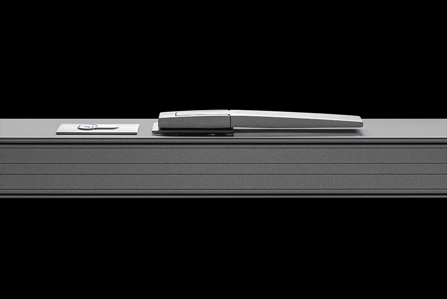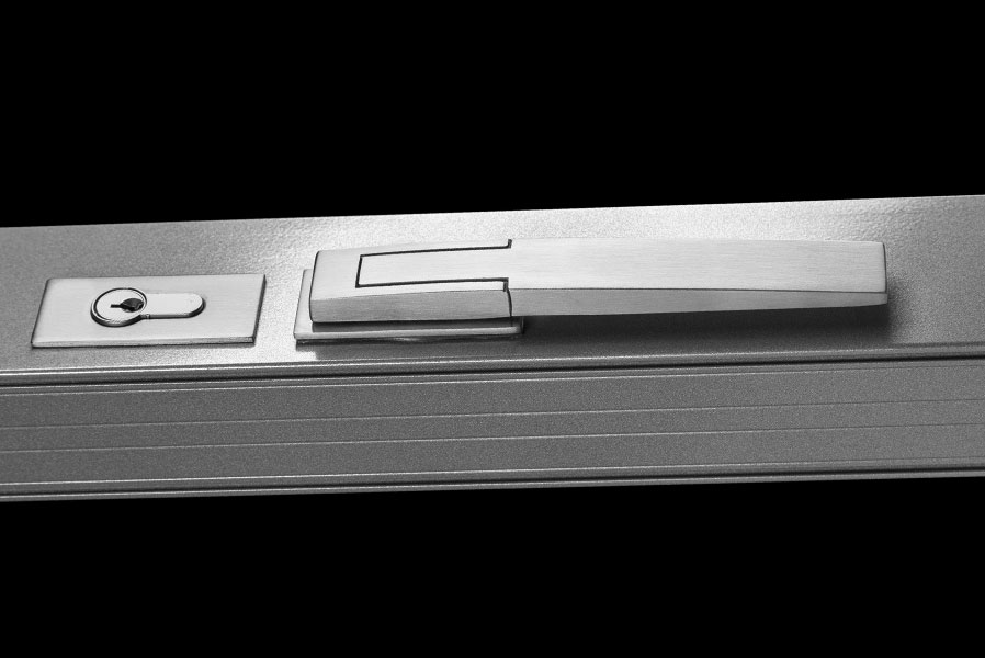 This swivel operator pushes stainless steel locking bolts into the frame at the top and bottom of the panel. The square corners of the handle are combined with radiused top and bottom surfaces to soften the aesthetics.